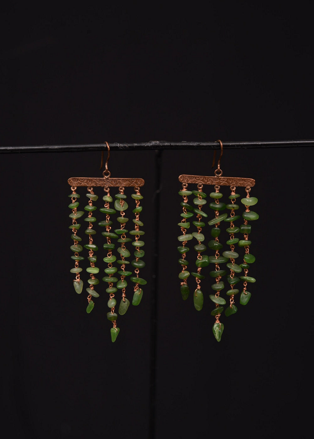 A pair of delicate copper earrings with dangling strings of natural emerald stone beads. A simple yet larger than life piece.